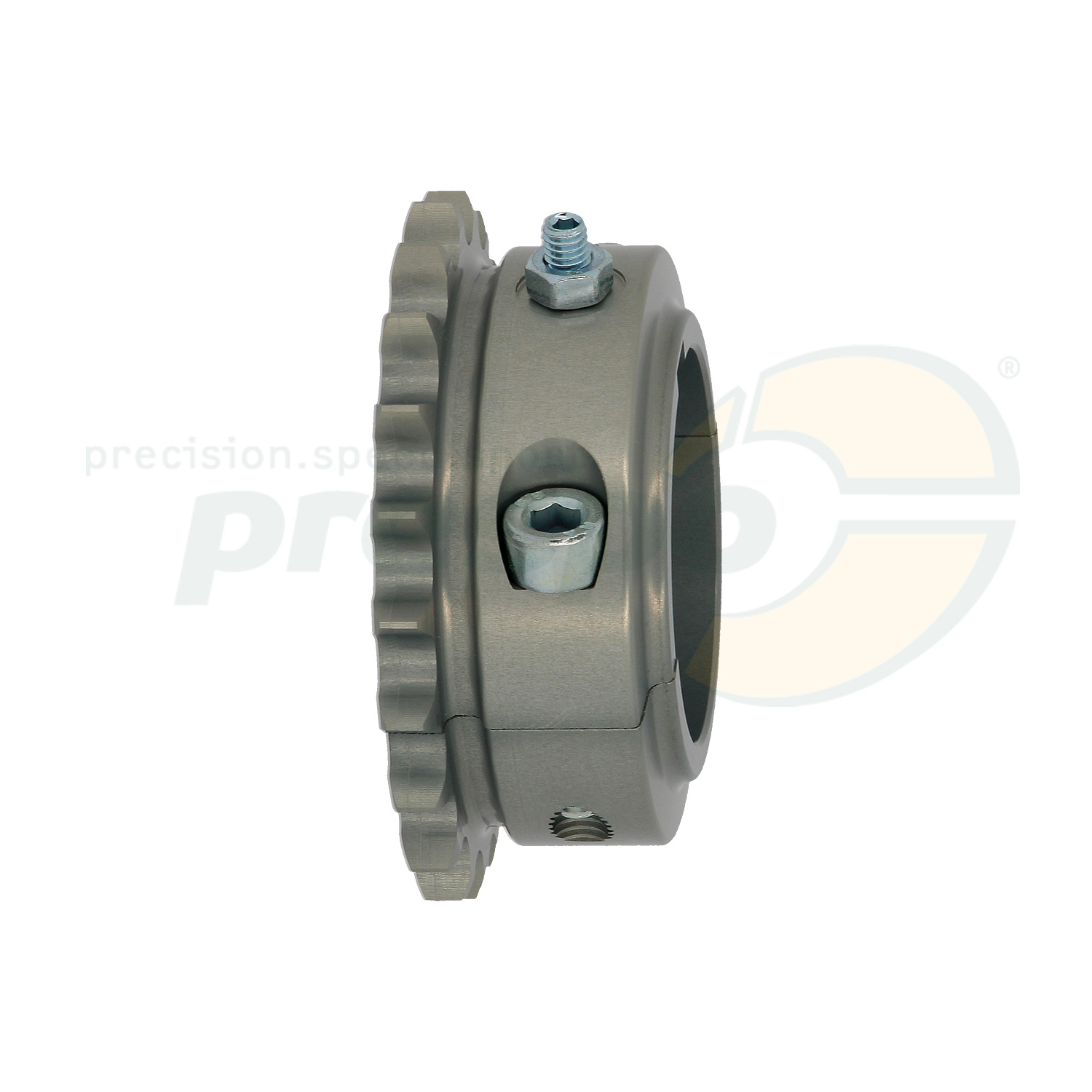 Zusätzlich ist das Kettenrad mit einer Sicherungsschraube für die Paßfeder ausgestattet.Die Paßfeder kann so sicher auf der Achse fixiert