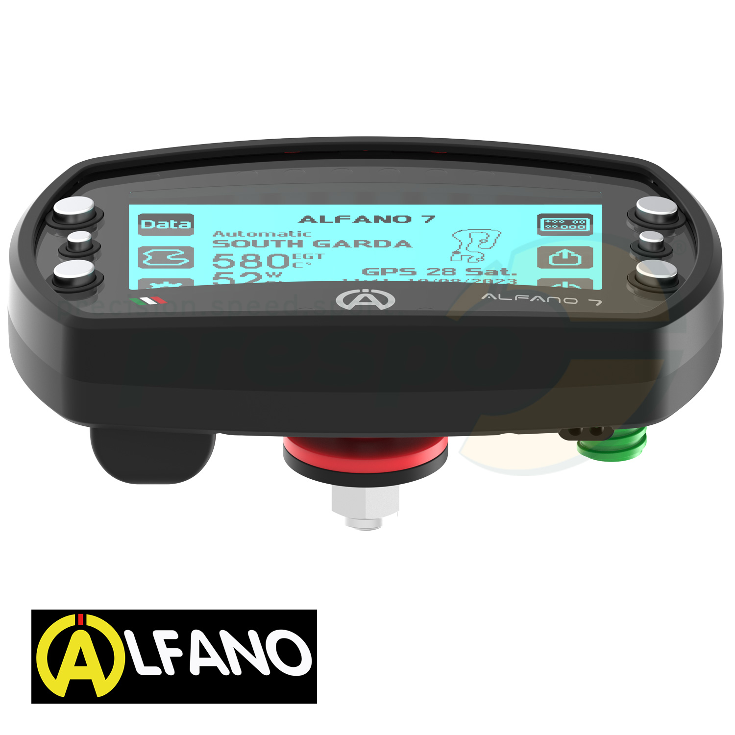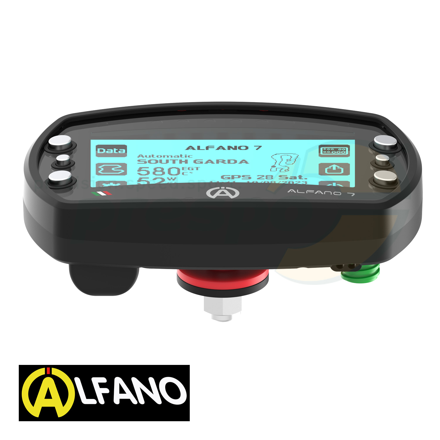 | Ein neues Gehäuse ziert das Alfano7 mit integriertem Kunststoffeinsatz für einen besseren GPS Empfang. Das Alfano 7 verfügt über ein GPS-Modul der neusten Generation mit 25HZ Frequenz. Als Satelliten stehen Navstar US, Glonass RU, Galileo EU und BeiDou zur Verfügung. Damit der Benutzer das Erscheinungsbild der diversen Anzeigen individuell anpassen kann, ist das hochauflösende Display frei konfigurierbar, genauso die LEDs. Deren Farben, Werte und Helligkeit können individuell eingestellt werden. Die Geschwindigkeit wird über GPS oder einem optionalen Speed-Sensor erfaßt. Weiter können 2 Temperatur-Sensoren z. B. für Wasser und Abgas an das Gerät angeschlossen werden. Der integrierte Lithium-Ion 3000 mA Akku garantiert eine Stromversorgung für mehr als 40 Stunden und kann durch ein Ladekabel aufgeladen werden. Das Herunterladen der Daten erfolgt weiter über eine Bluetooth Verbindung allerdings mit erhöhter Geschwindigkeit gegenüber dem Alfano 6. Optional steht ein Ultra schneller Dongle zum Dpownload zur Verfügung. NEU beim Alfano 7 sind W-LAN Sensoren zur Erfassung der Reifentemperatur bzw auch des Luftdruckes im Reifen.